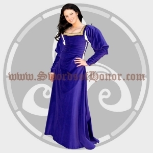 Wearing this classic cotton velveteen gown will take you right back to the early 1500s. This dress represents the area of Flanders which was historically a part of northern France. You can easily customize the fit of this dress using the lacing on each side of the bodice. Extra laces are added from the wrist to the elbow to adjust the fit of the sleeves. The sleeves are also detachable so that you can wear this gorgeous dress in all sorts of weathers. Like any true medieval gown this dress gathers firmly at the waist and gives a lift to your bosom so you do not need to wear a bra under the dress. You can easily wear a classic chemise under this gown. The chemise sleeves can be tucked into the upper arm area to give the gowns sleeves a fuller effect. This alluring gown is fully lined with smooth satin. This price is for gown only. Chemise and hat not included. Color shown is unavailable. Made in the U.S.A.